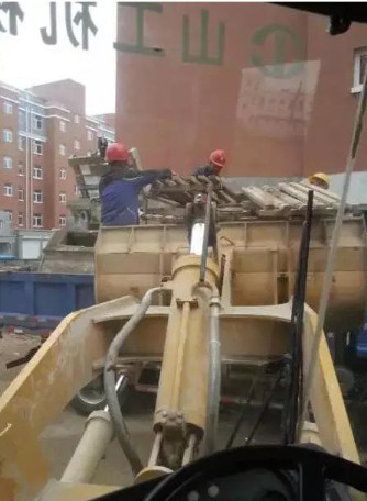 几个人站在装载机的铲斗里。