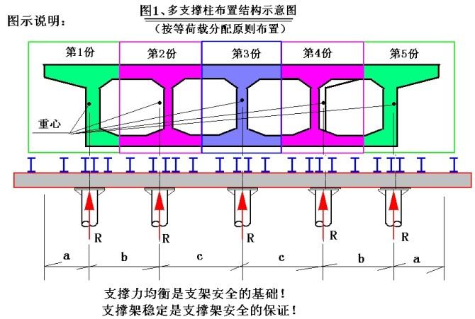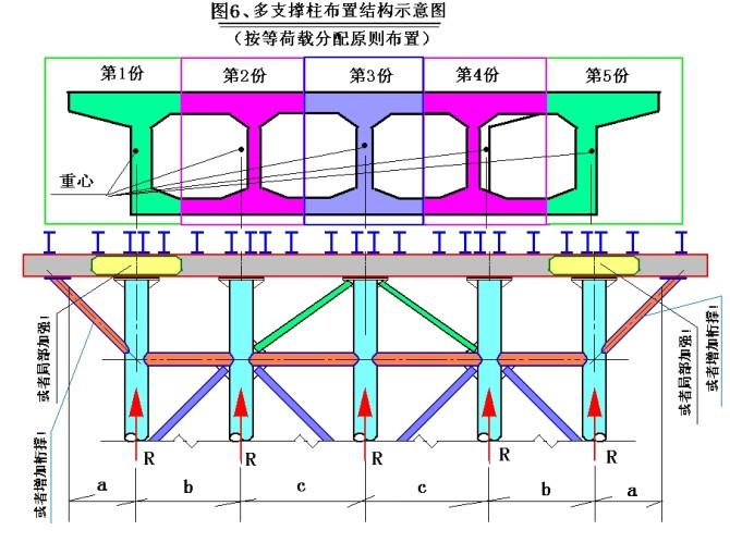 按平均横截面积的等份分配布置,支撑在每份截面重心线上,以确保每根支撑柱受力相等——平均分配。
