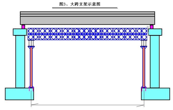 3、支架较高的墩身,以及临时地基地质条件较差的桥址条件,应优先考虑利用永久承台做大跨支架,并选择永久承台做临时基础。回避不良地质基础的风险,避免高支撑架受压不稳的风险。如图3所示。