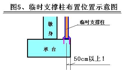 7、关于永久承台支撑控制要点有两:1是满足临时支点冲切的强度要求;2是满足承台边悬臂板抗弯曲强度的要求。一般布置在边缘不小于50cm以内。必要时增加抗剪、抗弯钢筋的配置。如图5所示。