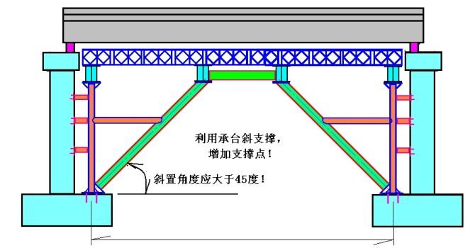 6、临时基础地基不好的地质条件的大跨支架,也可尝试利用承台增加斜支撑,以增加支点、降低纵梁跨度、减少沉降