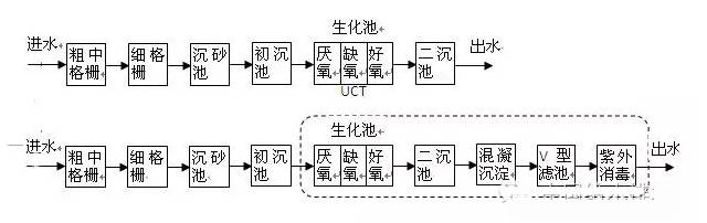 ,出水标准一级A。提标改造前后工艺流程详见图8。
