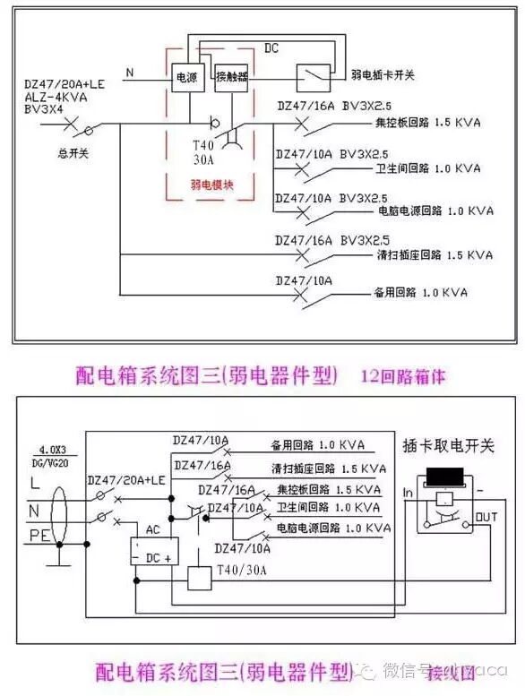 ●如果打算选择直流低压型插卡取电开关,订购配电箱时,必须向厂家提出提供DC低压电源模块,其成本比普通强电型约增加100元。同时还要落实低压型插卡取电开关的供应厂家(市场无该产品销售)。选择这种开关要向厂家提供需要的电压等级(取决于系统设计和与门铃,勿扰,微型接触器的电压配套),有DC5V,DC9V,DC12V,DC18V,DC24V的不同规格;还要提供输出的极性,(取决于配电箱内微型接触器的接线)有正输出(灌电流),负输出(拉电流)的区别。