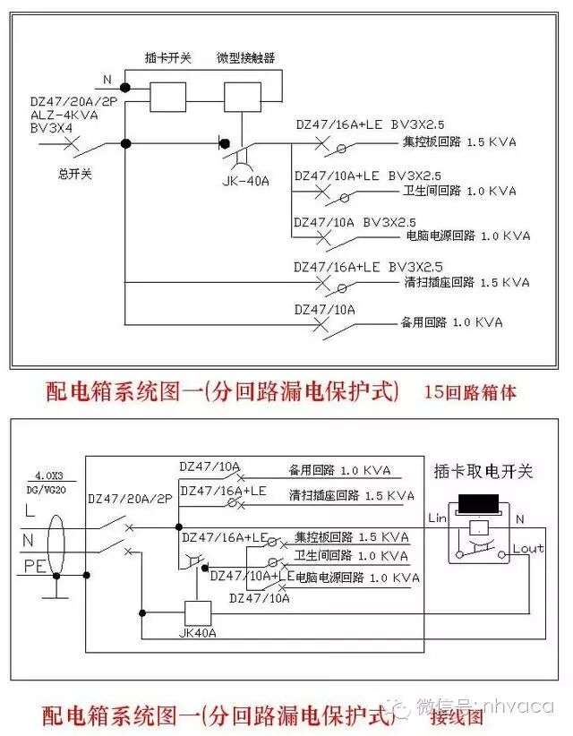 (如果在这个总开关上设置漏电保护开关,则下面的各个分支回路都受到这个漏电开关的保护,但缺点是:如果下面某个分支回路存在漏电故障,则只要一送电,总开关即保护调闸,使整个房间断电,使维修缺少照明,无法达到把故障仅限制在本身回路的最佳效果);常规的标准间,普通套房的总开关均可参照此容量选择。